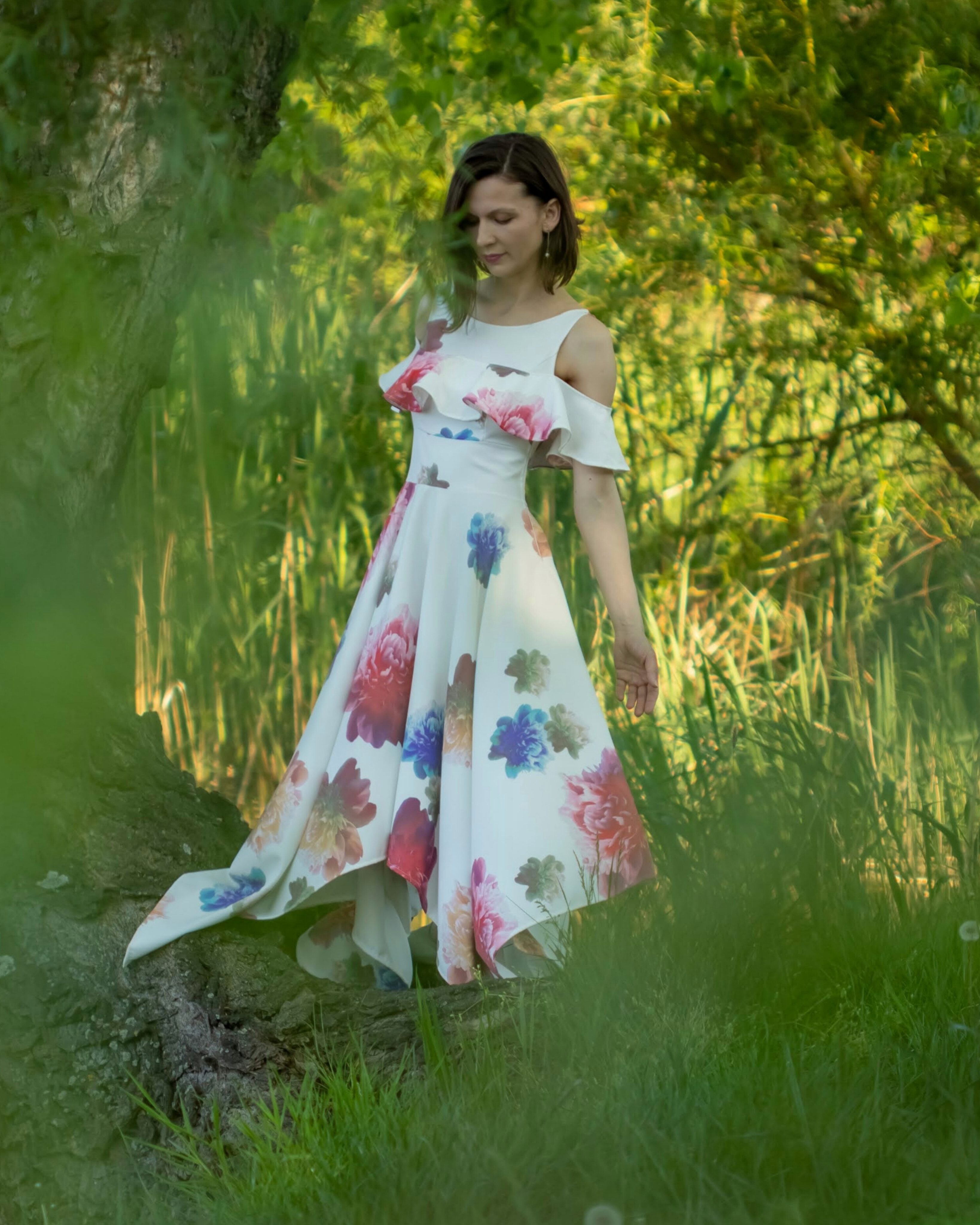 Šaty DIANA sú rozviaté, nežné, hravé...plné ľahkosti a plynutia. Sú ženské, sú éterické. Ak by víly chodievali z lesa na prechádzky do mesta, v mojich predstavách majú presne takéto šaty :o) Nádherný volán okolo ramien dodal týmto šatám presne tú vzdušnosť, voľnosť až hravosť, ktorými celé dýchajú. Veľká kruhová súkňa s cípmi celý tento charakter šiat len dotvorila. Výrazné, ale pritom veľmi jemné šaty. Keď si tieto šaty oblečieš v bežný deň, urobiš ho výnimočným. Presne takto výnimočne sa budeš cítiť aj TY, žena krásna...lebo žena by mala kráčať v nádherných šatách každý deň...len si to dovoľ a je to :o)